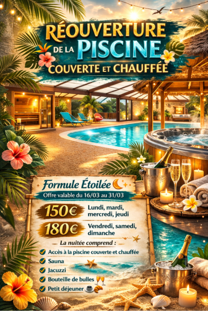 Pour un minimum de 2h, vous disposez de notre espace détente privatif (piscine couverte et chauffée, sauna, jacuzzi) entièrement privatif de 2 à 8 personnes.